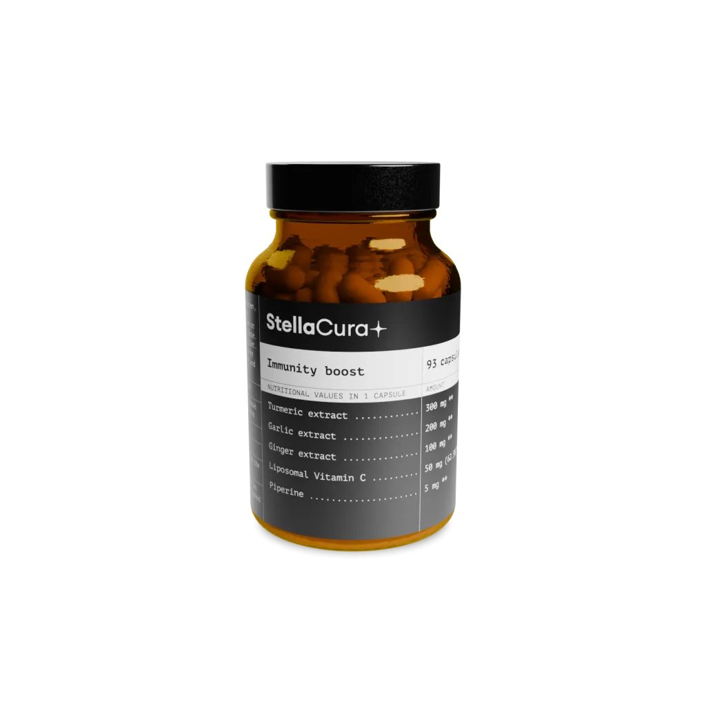 Výživový doplnok Immunity Boost je navržen pro posílení imunitního systému díky unikátní kombinaci aktivních látek. Kurkuma s kurkuminem a česnek s antimikrobiálními účinky podporují obranyschopnost organismu. Zázvor přispívá k normální funkci imunitního systému, zatímco liposomální vitamin C zajišťuje lepší vstřebávání a ochranu buněk před oxidačním stresem. Piperin zlepšuje biologickou dostupnost kurkumy.